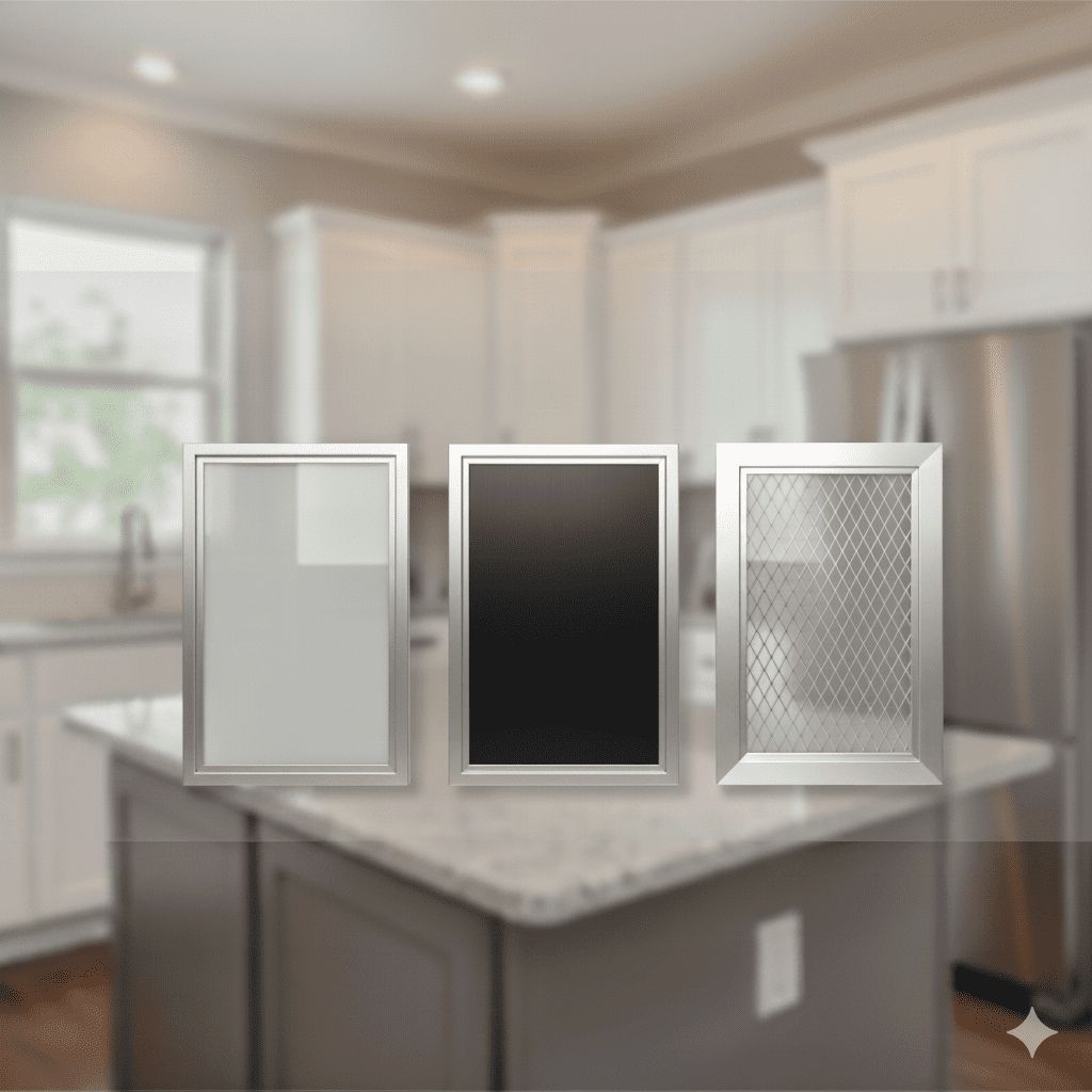 Our aluminum door panels with glass insets provide a modern, sleek style perfect for any contemporary kitchen design.