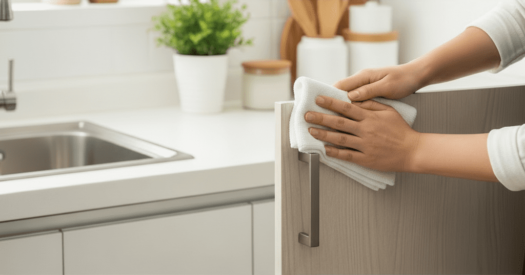 - Sponges or dish cloths. They may contain particles that could scratch your cabinets, or they may contain food and oil residue or remnants of harsh cleaning solutions.
